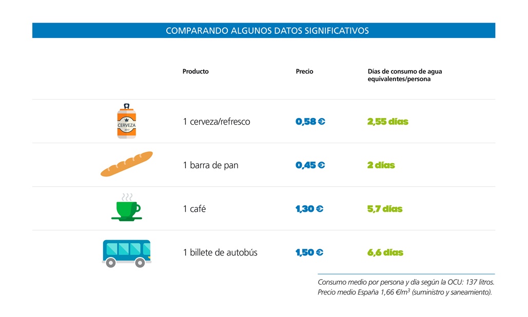 A pesar de que España es uno de los países con mayor escasez en recursos hídricos de Europa, la incidencia de la factura del agua en el presupuesto familiar es, de media, del 0,9%. Esto la sitúa muy por debajo del umbral del 3% marcado por la ONU como cifra límite de asequibilidad del Derecho Humano al Agua. En nuestro país, el precio medio del agua del grifo se sitúa en 1,66 €/ m3 (1 m3 = 1000 litros), lo que sitúa la tarifa del agua de nuestras ciudades muy por debajo de lo que se paga en otras urbes europeas. Por poner un ejemplo, en Copenhage el precio del agua se sitúa en 4,99 m/3 y en París en 3,49 € m/3