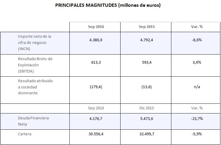 EBIT was negative in the amount of €44.4 million in the first nine months of 2016, contrasting with €273.9 million in the same period of 2015. This change is attributable to a 299.9 million euro impairment in the Cement division because of the delay in the expected recovery in demand, particularly in Spain, as a result of the unexpected cutback in public expenditure in the period.