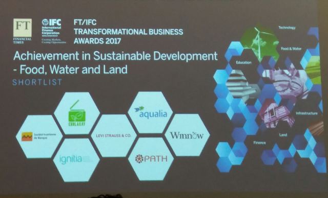 Aqualia ha sido finalista en la categoría al Desarrollo Sostenible en alimentación, agua y territorio (Achievement in Sustainable Development, with a focus on Food, Water and Land). La empresa ha competido con iniciativas como Levi Strauss Water<Less (un ambicioso proyecto de reducción del consumo de agua en sus factorías del gigante textil americano) o la ganadora del premio Winnow (un desarrollo tecnológico global de optimización de alimentos en grandes cocinas y en el que confían cadenas hoteleras como Sofitel o Accor).