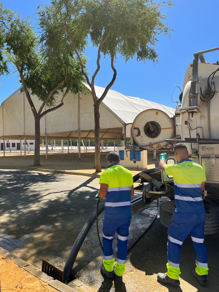 En cuanto al alcantarillado, Aqua Campiña ha limpiado las más de 120 rejillas de imbornales y acometidas y unos 3.650 metros de la red de alcantarillado del recinto ferial, de los que ha extraído alrededor de 250 kg de residuos.
