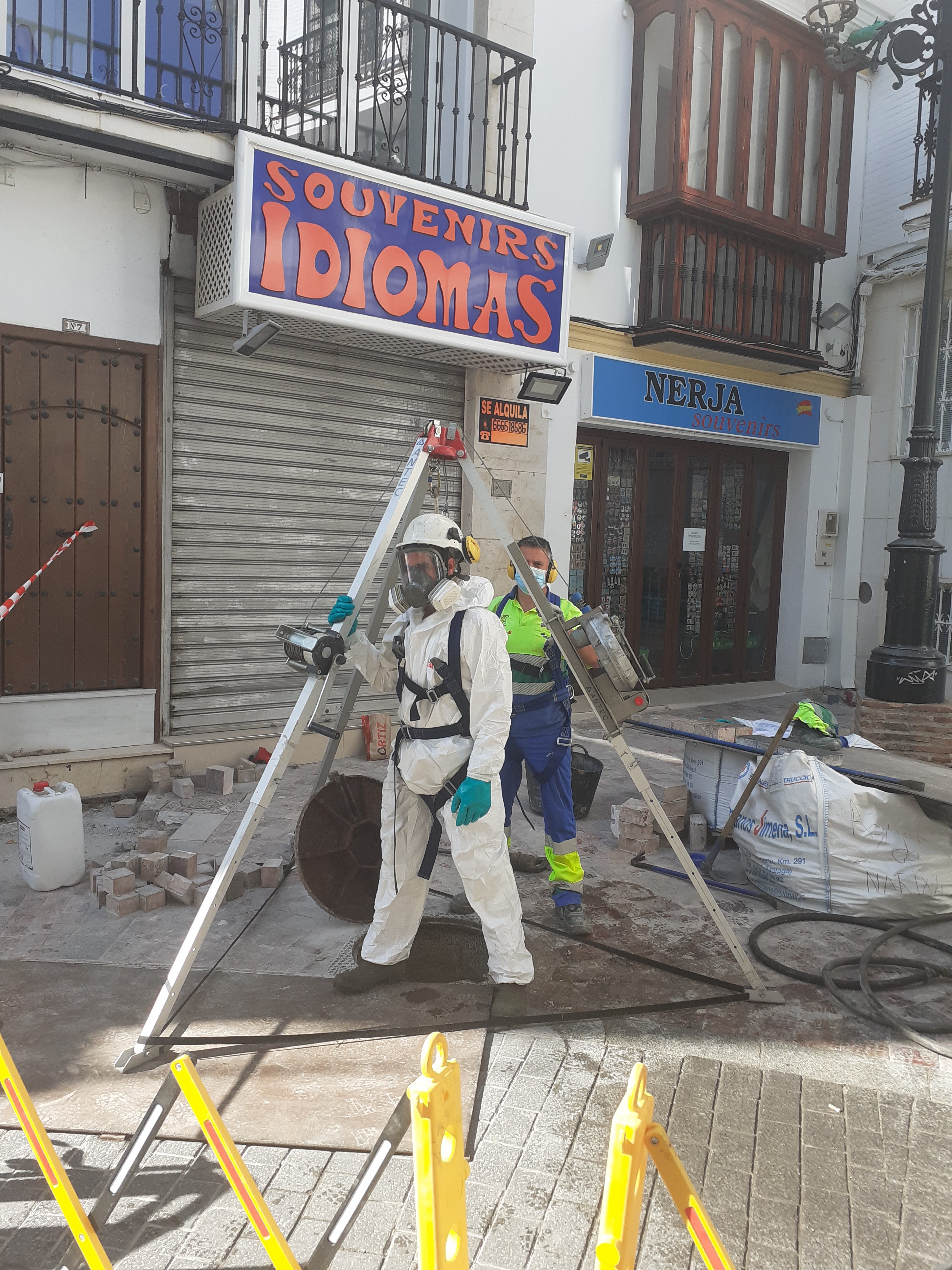 Un trabajador de Aguas de Narixa se introduce en la red saneamiento de Nerja